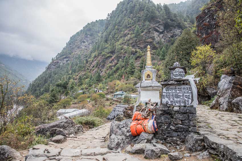 Der erste Tag der Trekking Tour zum Mount Everest zeigt sich mit all den Facetten des Landes. Bunte wehende Gebetsfahnen, drehende Gebetsmühlen und Manisteine.