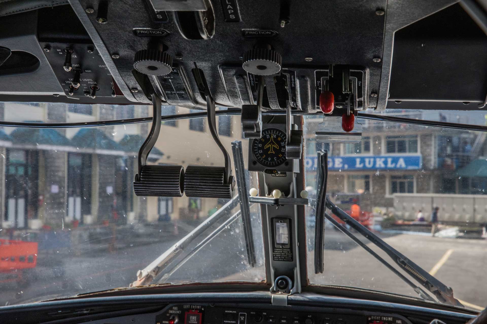 Da stehe ich nun – vor dem Flugzeug, das mich auf einem kurzen Flug an den gefährlichsten Flughafen der Welt bringt – nach Lukla. Kurze Zeit später sitze ich in der Maschine einer THC 6 Twin-Otter direkt hinter den Piloten, mit Blick ins Cockpit. Eine Stewardess geht den kurzen Gang der Maschine ab und verteilt Bonbons und Watte für die Ohren, bevor die Propeller für den Flug angeworfen werden.